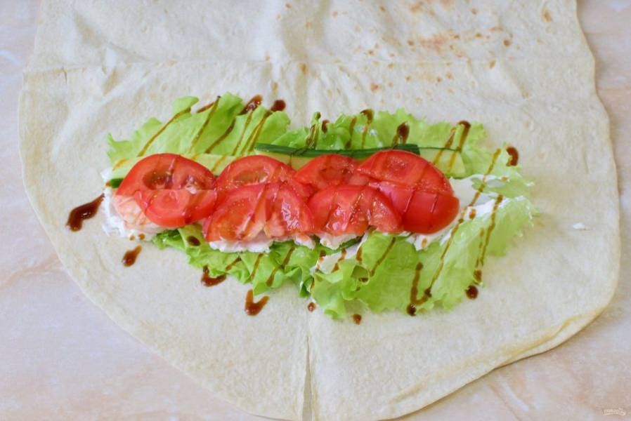Добавьте ломтики помидора. Сверху немного полейте соусом терияки или унаги.