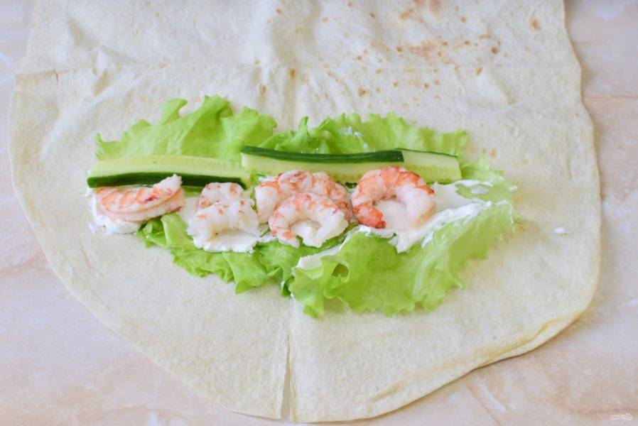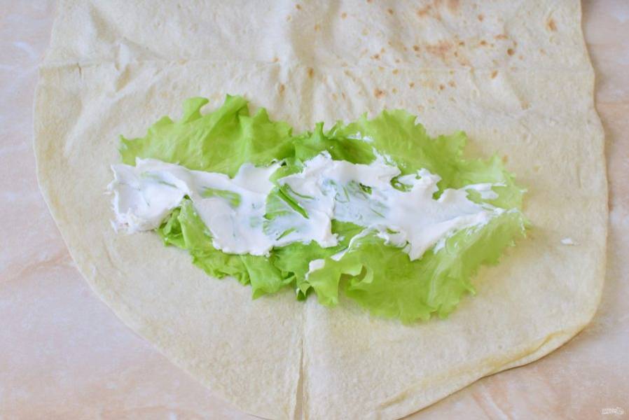 На столе разложите лист лаваша. Выложите листья салата и смажьте их творожным сыром.
