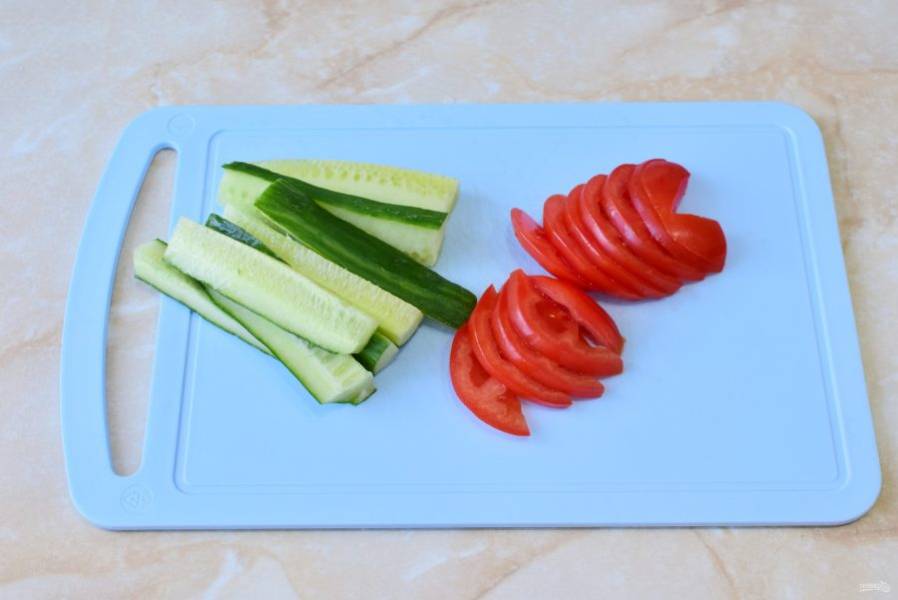 Нарежьте тонкими слайсами помидоры и брусочками огурец.