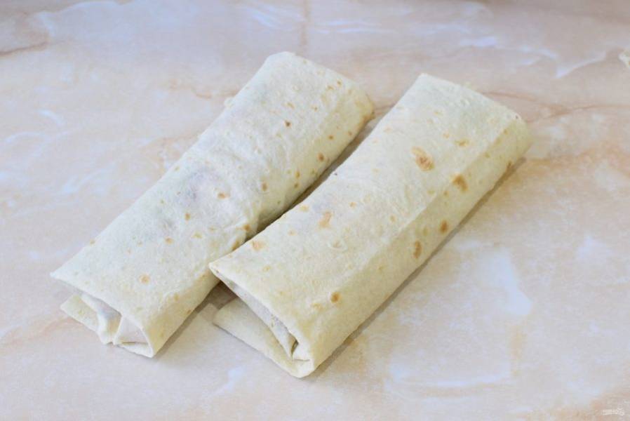 Заверните лаваш по краям, а потом сверните в рулет. Обжарьте на сухой сковороде с двух сторон.