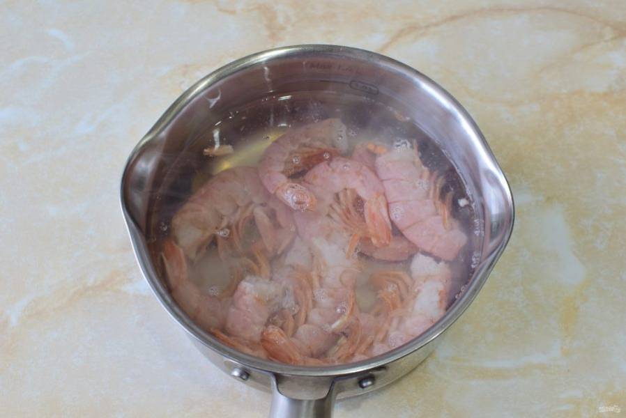 Креветки опустите в кипящую воду и проварите 2-3 минуты. Затем откиньте на дуршлаг, остудите и очистите.