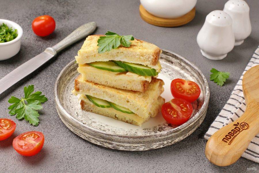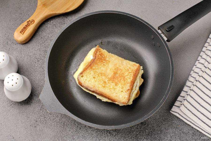 Сложите сэндвич пополам, как книжку, и подрумяньте с двух сторон.