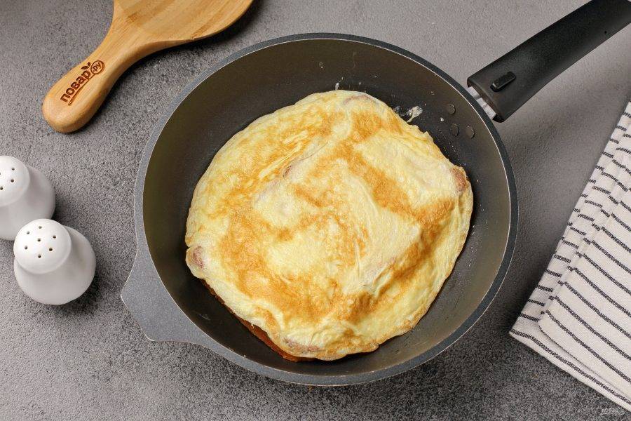 Как только омлет схватится, аккуратно его переверните, хлеб должен оказаться снизу.