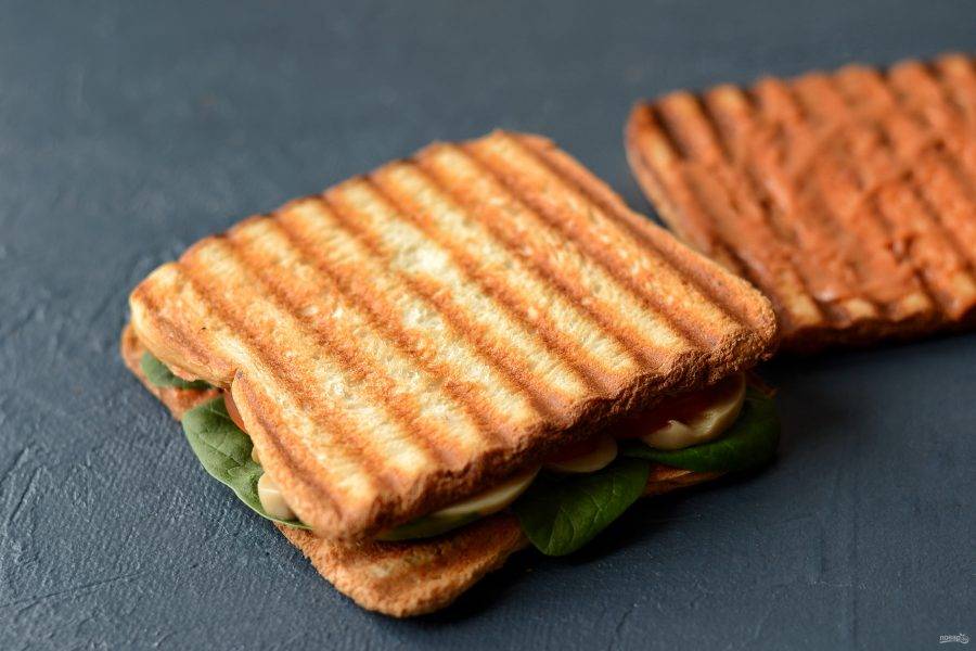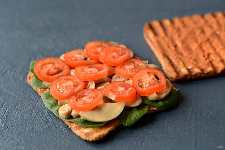 На один кусочек положите лист шпината, шампиньоны и порезанный помидор кружочками. Посолите и поперчите.