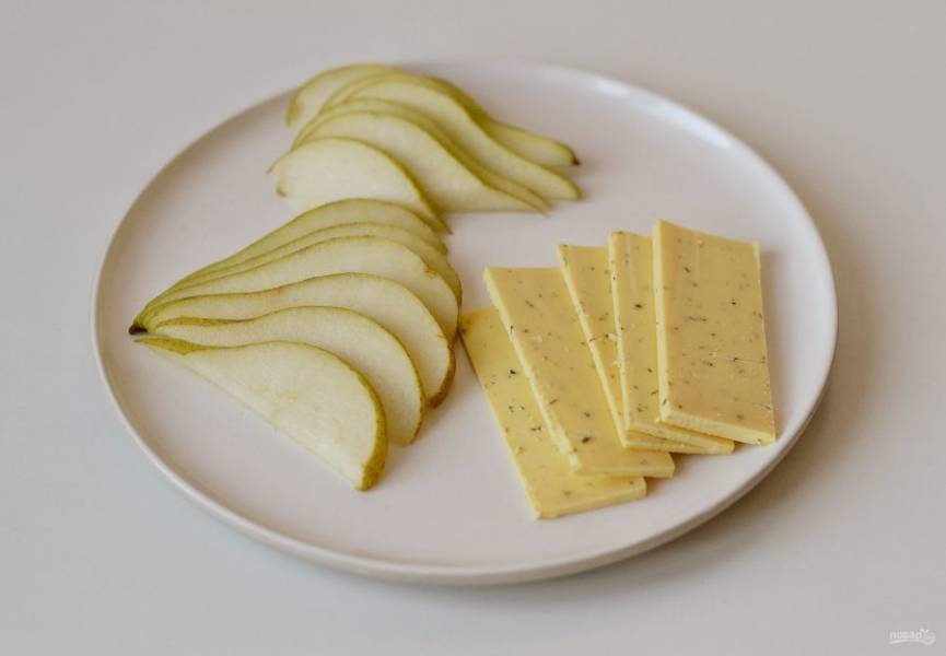 Грушу помойте, удалите сердцевину, нарежьте дольками. Сыр нарежьте ломтиками.