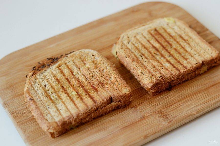 Накройте хлеб второй половиной. Обжарьте сэндвичи на гриле или сковороде, пока сыр не расплавится. Примерно по 3 минуты с каждой стороны.