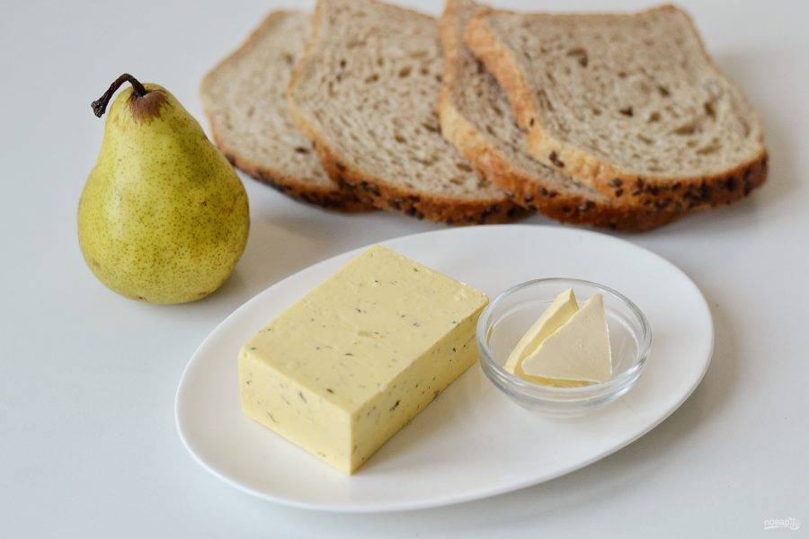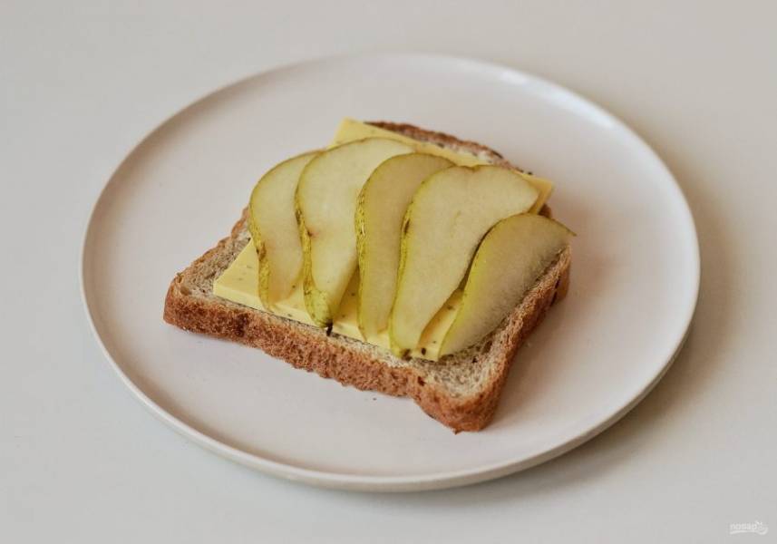Смажьте хлеб сливочным маслом. Сверху выложите сыр и ломтики груши.