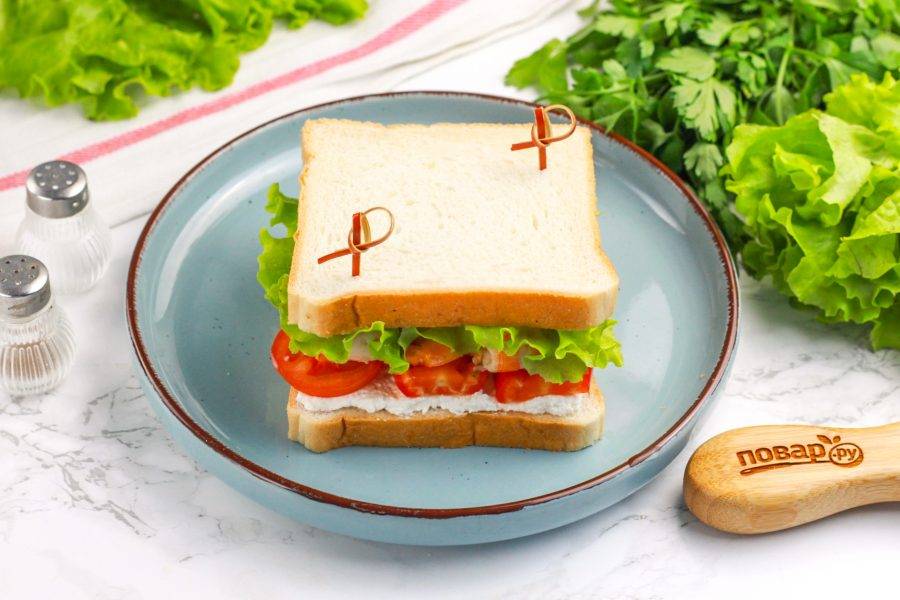 Острым ножом разрежьте сэндвич по диагонали и выложите одну половину на другую. Закрепите зубочистками и подайте к столу. Приятного вам аппетита!