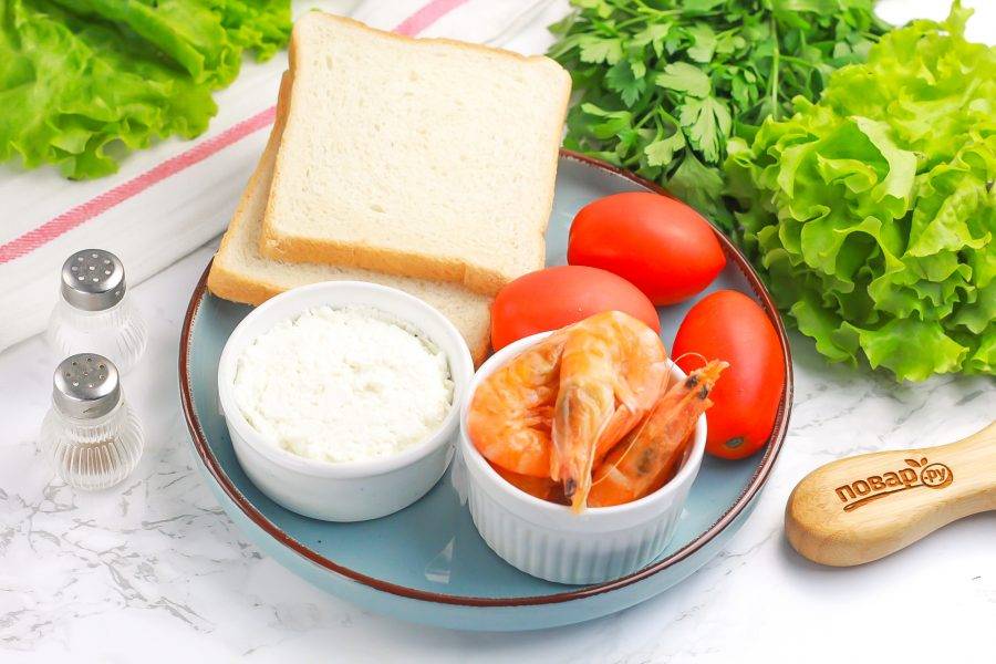 Подготовьте указанные продукты. Вместо творожного сыра можно использовать сливочный или соус "Песто", чесночный. Креветки отварите заранее и остудите. Если они крупные, удалите панцири, головы, пищевод и промойте.