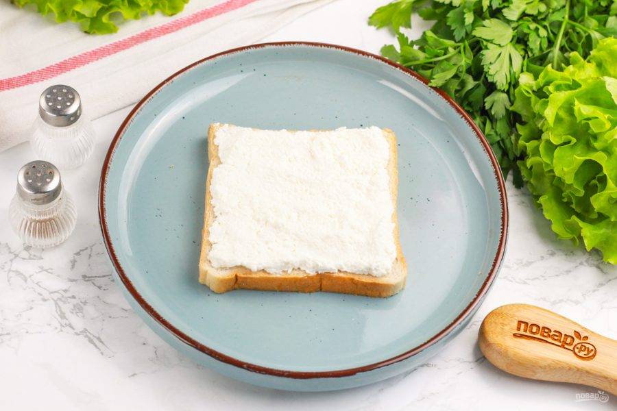 Подготовьте тостовый хлеб и обмажьте его творожным сыром.