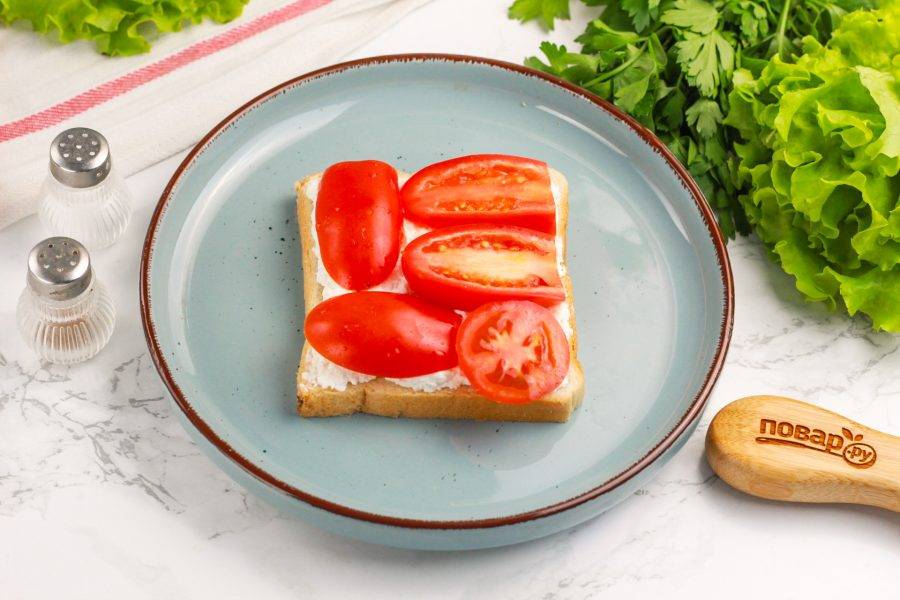 Промойте помидоры и вырежьте зеленые сердцевинки. Нарежьте ломтиками и выложите на сыр.