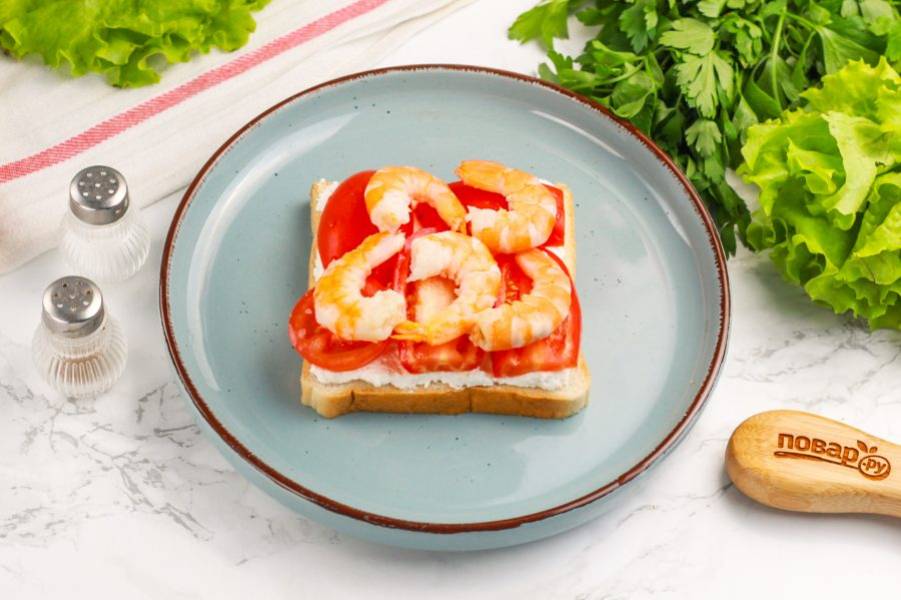 Очищенные хвосты креветок выложите на помидоры. По желанию можно нарезать их кубиком или слайсами. Посолите креветки, по желанию — поперчите.