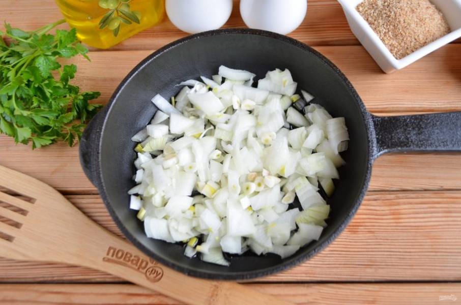 Репчатый лук и чеснок очистите и порубите мелко острым ножом. Обжарьте на столовой ложке масла со щепоткой соли до мягкости.