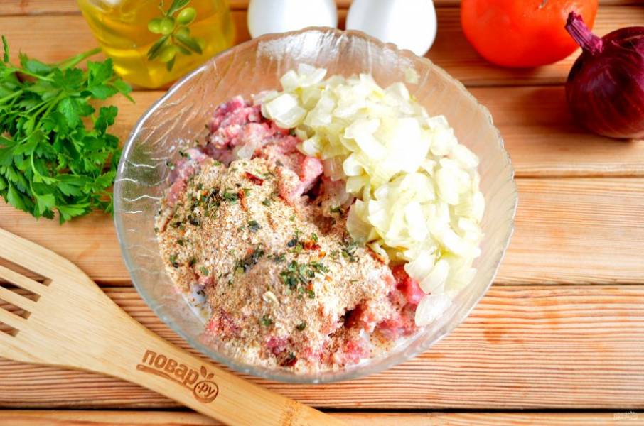 В фарш добавьте жареный лук, панировочные сухари, молоко, соль, специи.