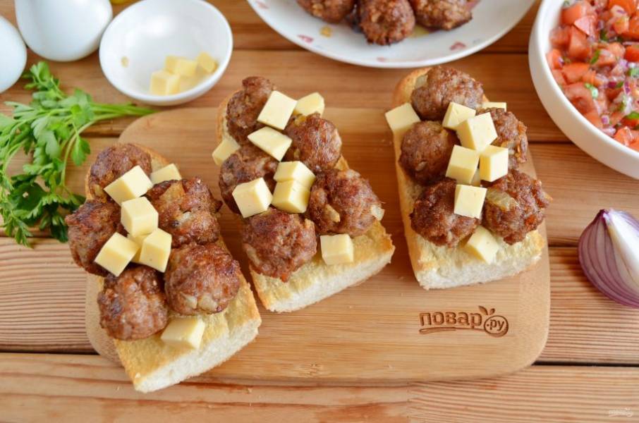 На булочки уложите сверху мясные шарики, кусочки сыра и отправьте в духовку до расплавления сыра.