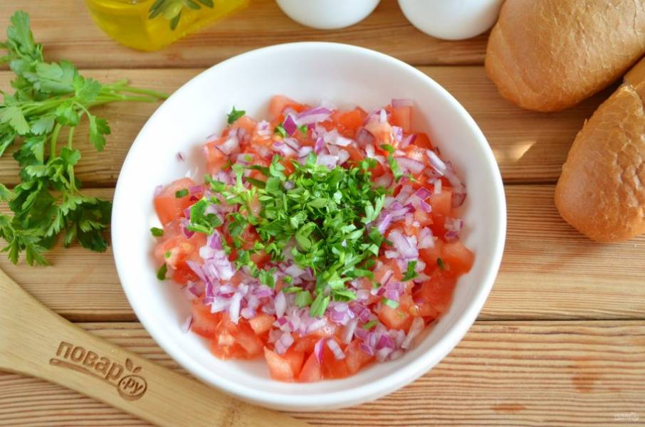 Пока готовятся мясные шарики, приготовьте сальсу. Для этого порежьте кубиками помидор, фиолетовый лук, измельчите петрушку. Перемешайте овощи и заправьте уксусом и щепоткой сахара.
