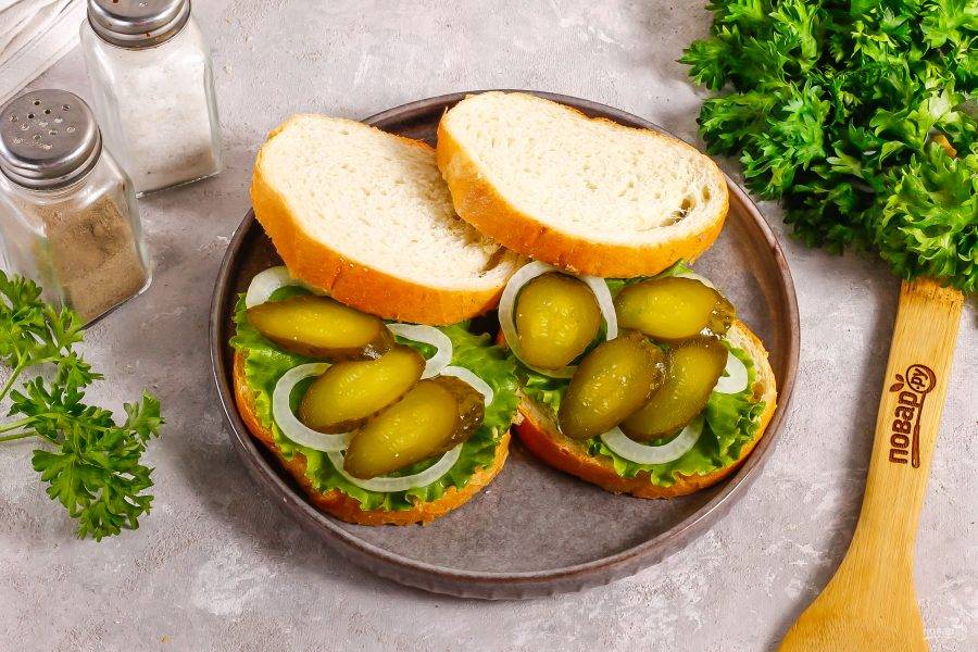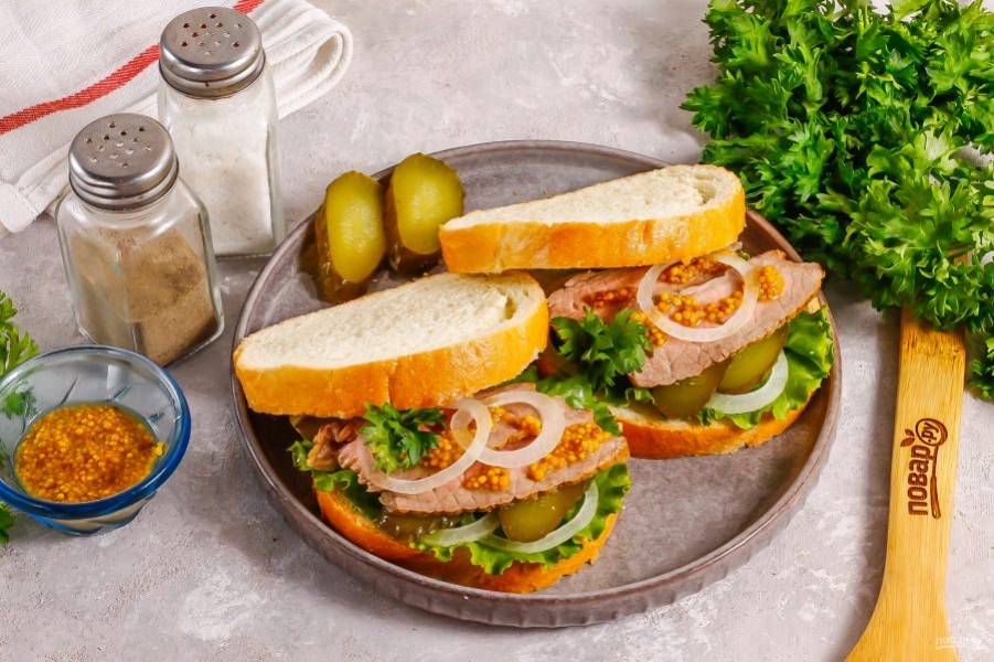 Добавьте зерновую горчицу по вкусу, кольца лука и накройте ломтиками хлеба, собирая сэндвичи.