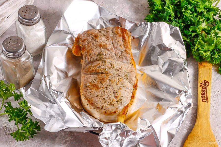 Затем разогрейте духовку до 200 градусов. Заверните обжаренное мясо в фольгу и запеките примерно 10 минут в разогретой духовке. Извлеките и оставьте в фольге еще на 10 минут.