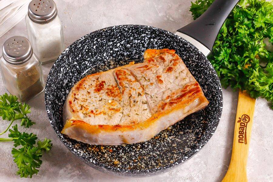 Прогрейте растительное масло на сковороде, выложите в него кусок говядины и обжарьте с обеих сторон до румяности по 3-4 минуты.