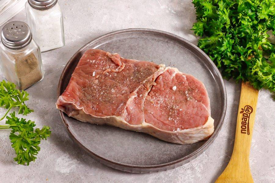 Говядину промойте в воде, срежьте жилы и обсушите бумажными салфетками. Натрите приправой, солью и молотым черным перцем с обеих сторон.