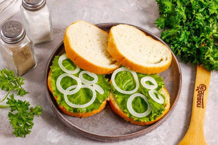 В это время очистите лук от кожуры и промойте вместе с листьями салата. Стряхните лишнюю влагу. Выложите салат на ломтики хлеба. Лук нарежьте кольцами и выложите на салат.