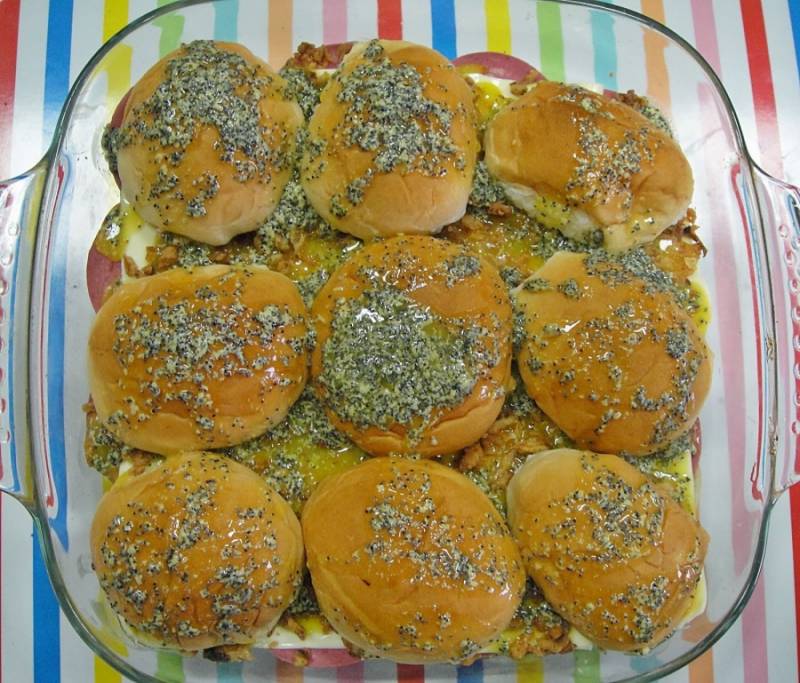 Булочки накрыть верхушками и полить маслом смешанным с горчицей и маком. Запекать при 180 градусах 20 минут.