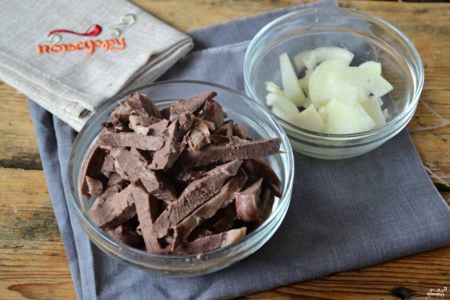 Подготовьте все необходимые ингредиенты. Сердце заранее отварите до готовности в подсоленной воде. Среднее время приготовления сердца — около 1,5 часа.