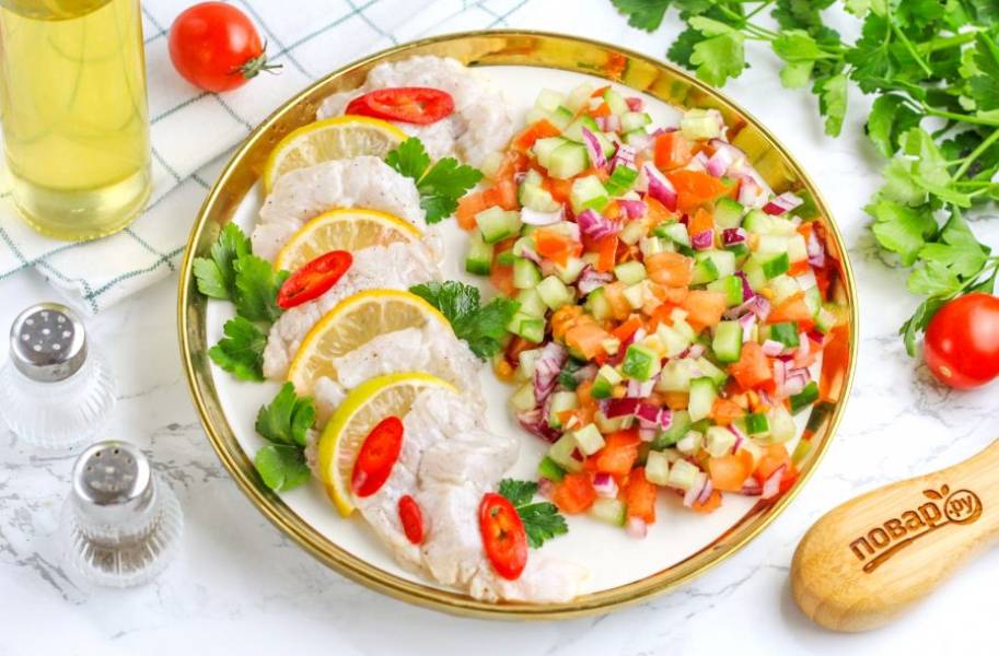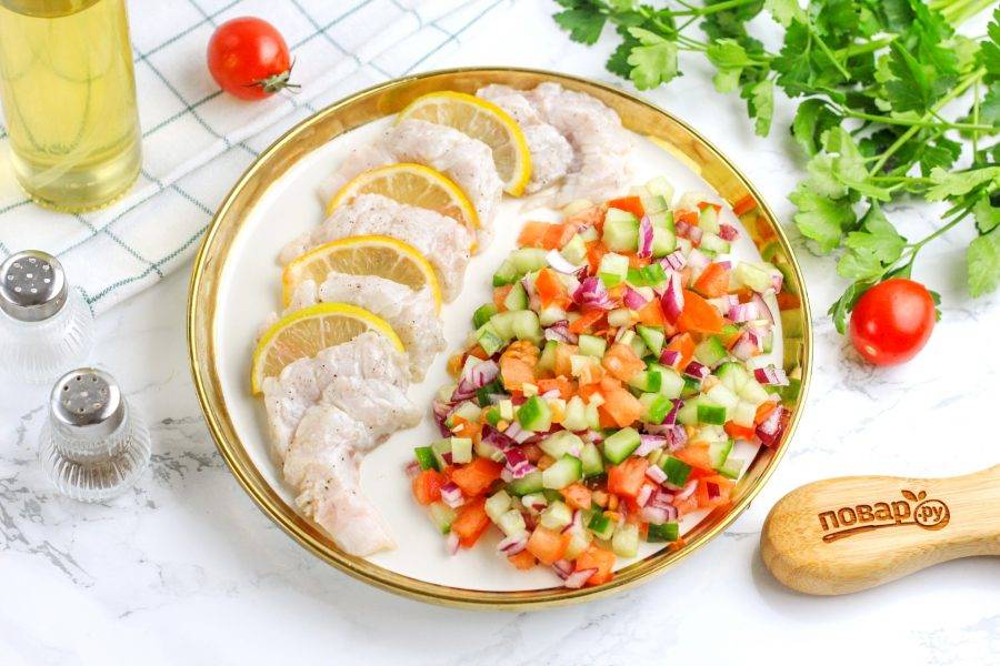 Нарежьте мелкими кубиками, огурец, помидор и красный лук. Добавьте немного перца чили, сбрызните соком лимона и растительным маслом. Добавьте овощную сальсу на тарелку к севиче.