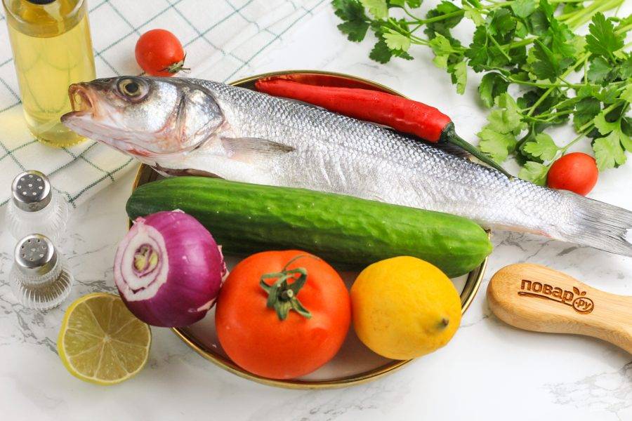 Подготовьте указанные ингредиенты. Лук очистите и промойте вместе с другими овощами. Сибаса выпотрошите, удалите чешую, промойте.