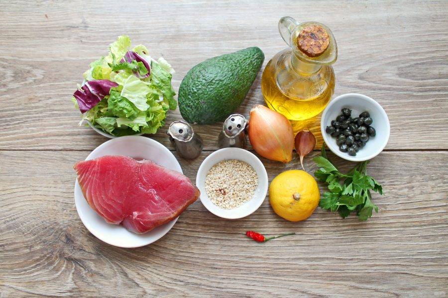 Подготовьте все необходимые ингредиенты для приготовления севиче из тунца с авокадо.