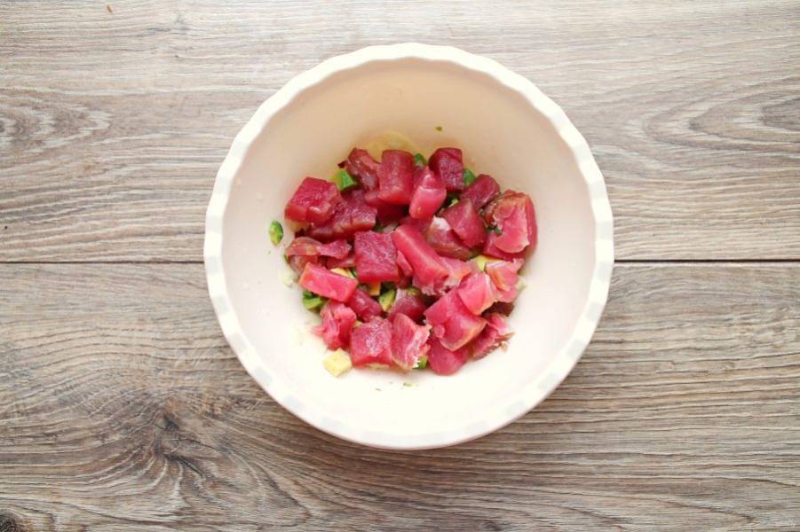 Тунец порежьте средним кубиком, все перемешайте и уберите в холодильник на 20 минут для маринования.