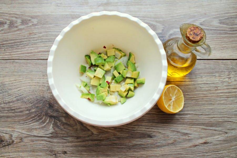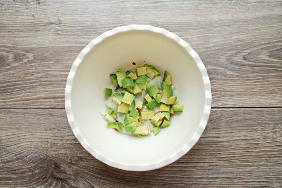 Авокадо очистите от кожуры и порежьте кубиком, добавьте в миску с луком и чесноком.