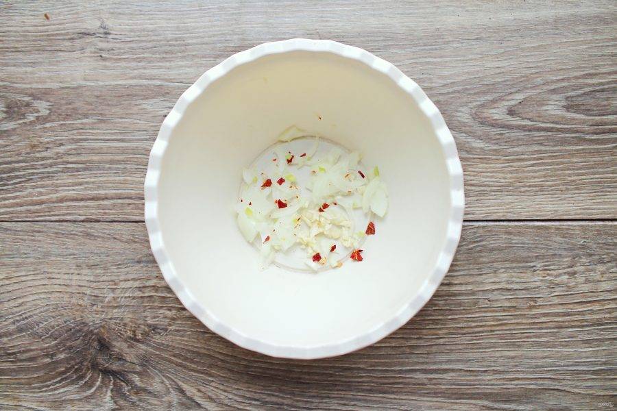 Репчатый лук порежьте тонкой соломкой, добавьте измельченный чеснок и хлопья красного острого перца.