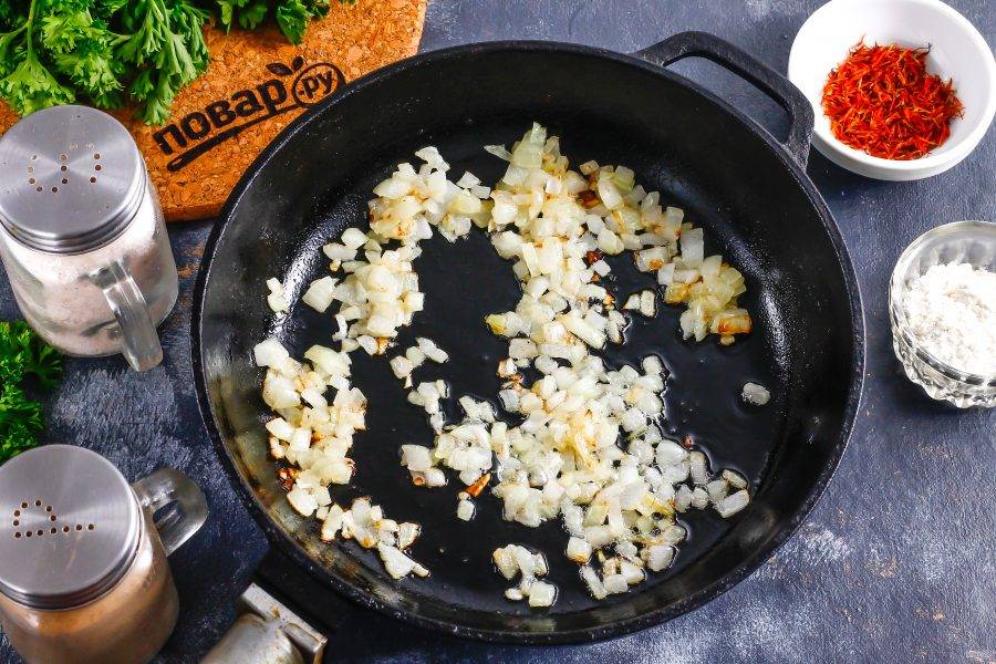 Репчатый лук очистите от шелухи и промойте в воде. Нарежьте мелкими кубиками и отпассеруйте в растительном масле на сковороде примерно 3-4 минуты до румяности.