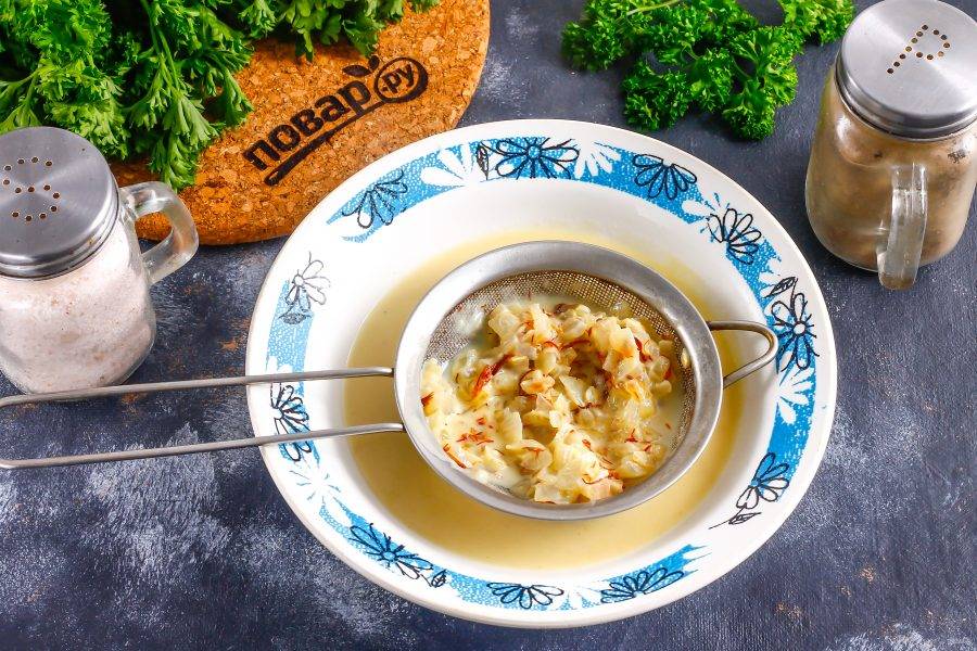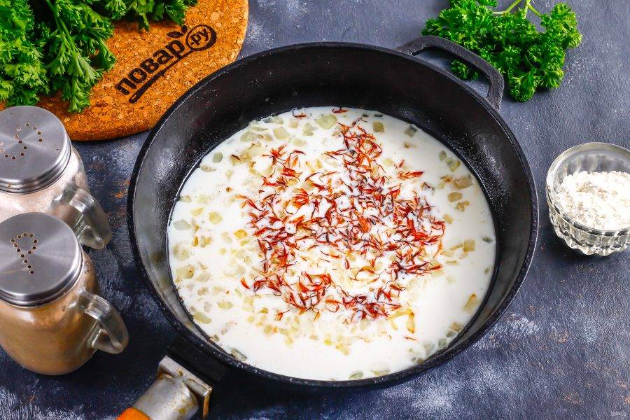 Всыпьте шафран, и прогрейте соус еще 1-2 минуты.