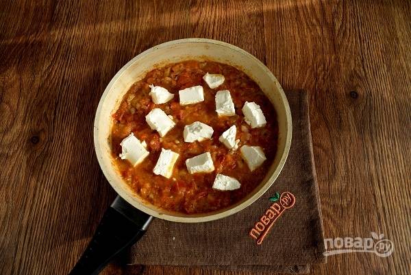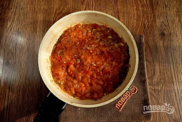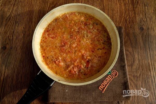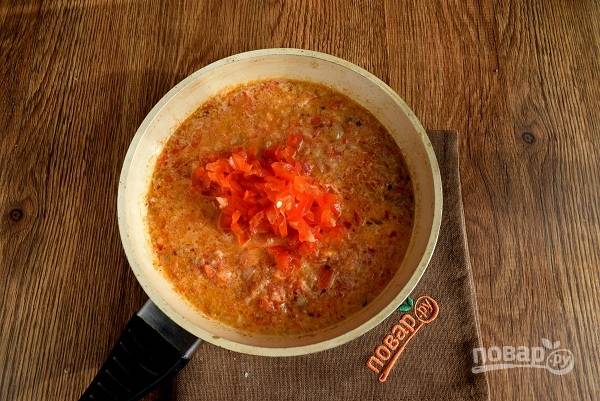 Добавьте помидоры, порезанные на маленькие кубики. Протушите их (около 5 минут). Если помидоры дали много кислоты, добавьте по вкусу сахар.