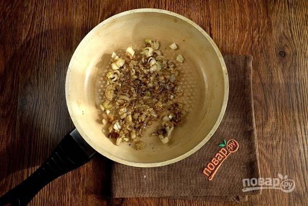 Разогрейте на сковороде масло, высыпьте специи, немного прогрейте. Добавьте измельченный лук, пассеруйте его до мягкости.