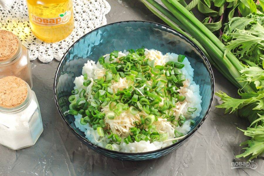 Натрите брынзу или твердый сыр на терке с мелкими ячейками. Промойте зеленый лук и измельчите, добавьте в емкость.