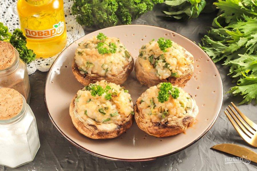 Выложите шампиньоны фаршированные рисом на тарелки и подайте к столу. Приятного аппетита!