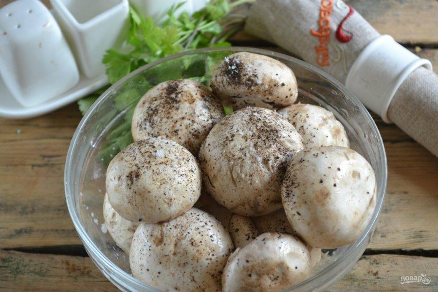 2. Шампиньоны, не очищая, промойте хорошенько проточной водой. Присыпьте солью и перцем, сбрызните лимонным соком и хорошенько перемешайте. Оставьте мариноваться на 2-3 часа.
