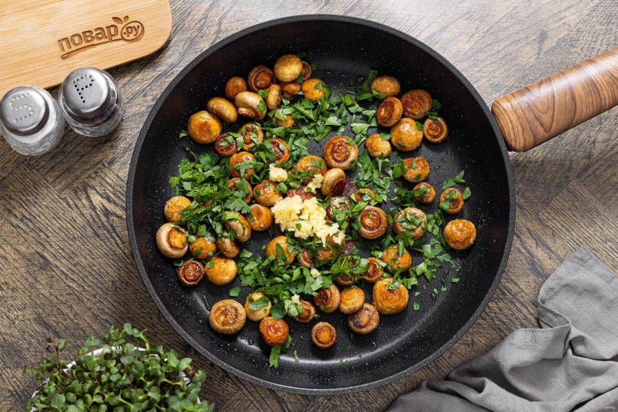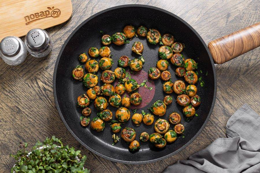 Прогрейте еще 1-2 минуты все вместе, чтобы чеснок раскрыл аромат, а петрушка осела. После снимите с плиты и подавайте.