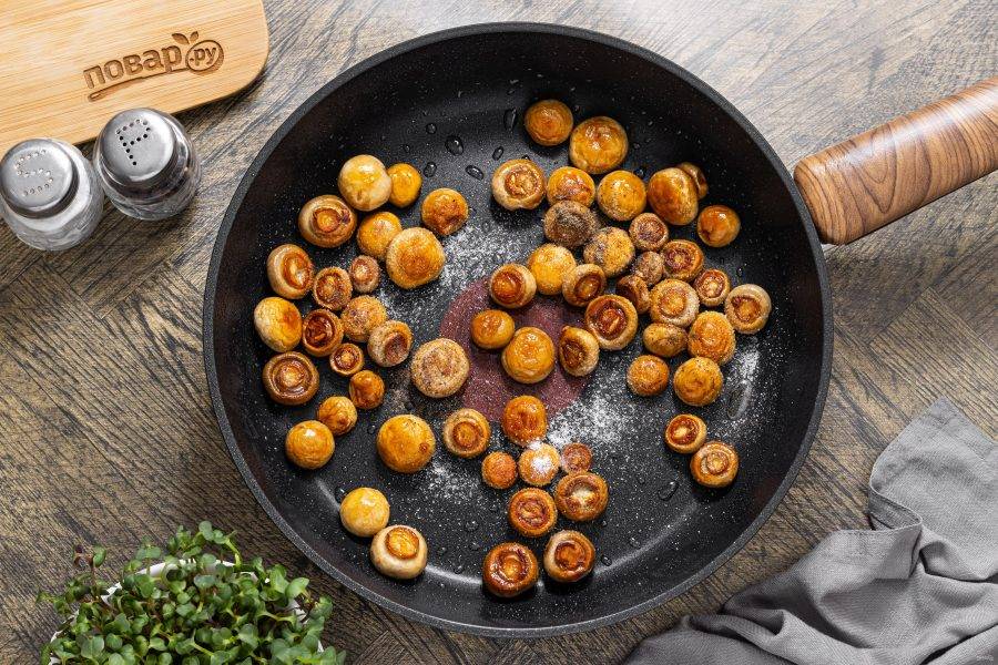 Из грибов должна выпариться вся лишняя жидкость, а сами грибы приобрести золотистый цвет.