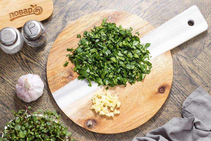 Петрушку мелко порубите. Чеснок пропустите через пресс.