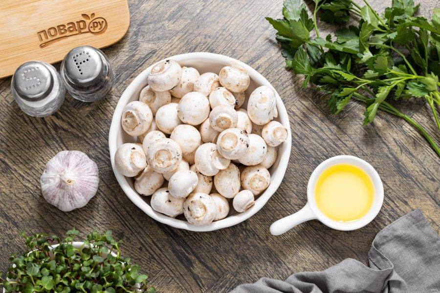 Шампиньоны тщательно помойте. Обсушите. Крупные грибы можно разрезать пополам, а маленькие и средние лучше оставить целыми.