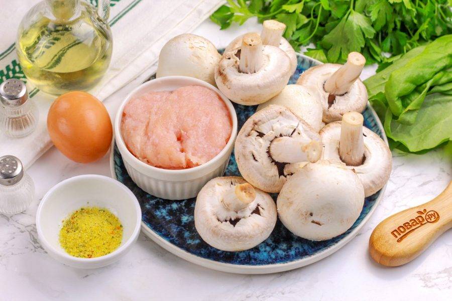 Подготовьте указанные продукты. Шампиньоны выбирайте средние или крупные, так как они существенно уменьшатся в размерах. Фарш — куриный с жирком.