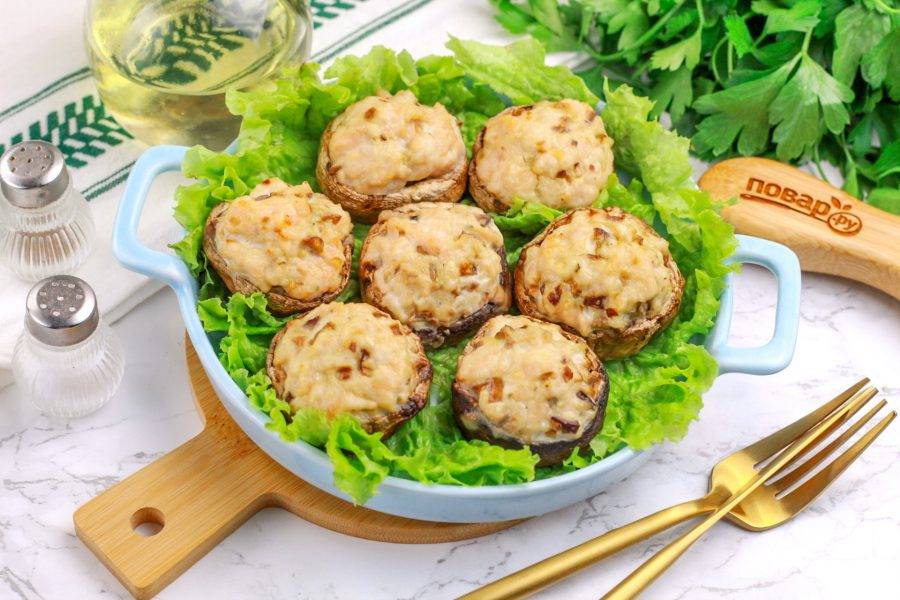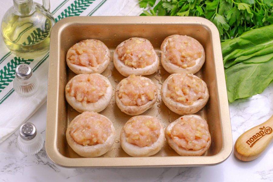 Аккуратно начините фаршем приготовленные шляпки шампиньонов, выкладывая его с горкой.