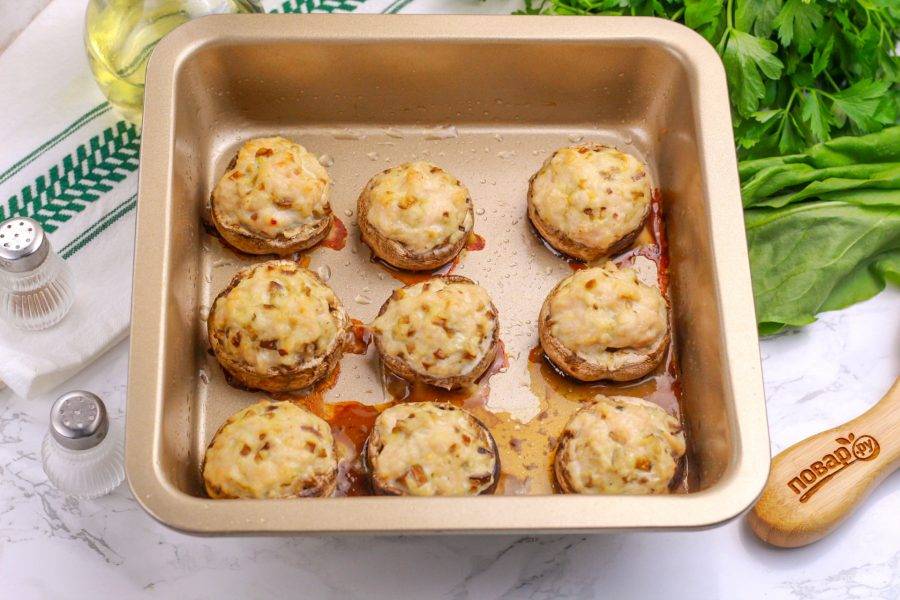 Разогрейте духовку до 180 градусов и запеките в ней грибы примерно 25-30 минут до румяности. Они существенно уменьшатся в размерах, но мясной сок пропитает их изнутри.
