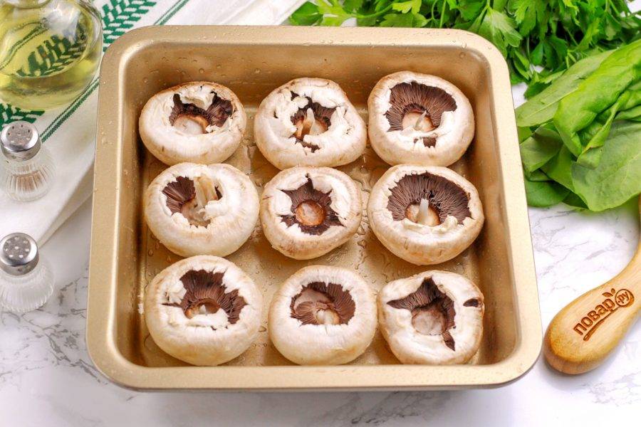 Шампиньоны промойте, аккуратно удалите ножки, а шляпки подсушите бумажными салфетками. Смажьте или сбрызните форму растительным маслом и выложите в нее шляпки грибов.