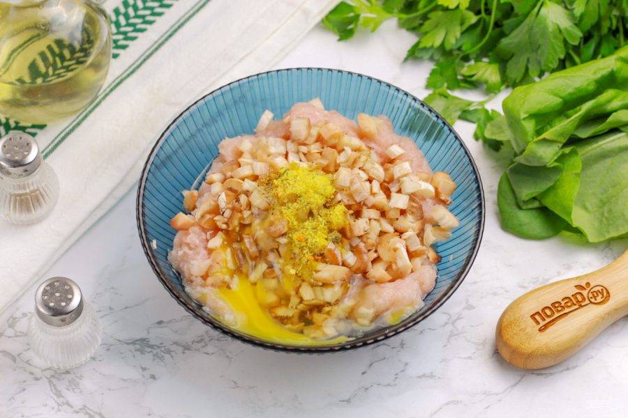 Нарежьте оставшиеся грибные ножки мелким кубиком и добавьте в фарш вместе с универсальной приправой. Добавьте мелкое куриное яйцо или же его половину, чтобы начинка не получилась слишком жидкой. Тщательно все перемешайте.
