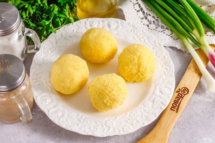 Залепите края лепешки и скатайте в шарик. Так создайте и остальные шарики из мамалыги.